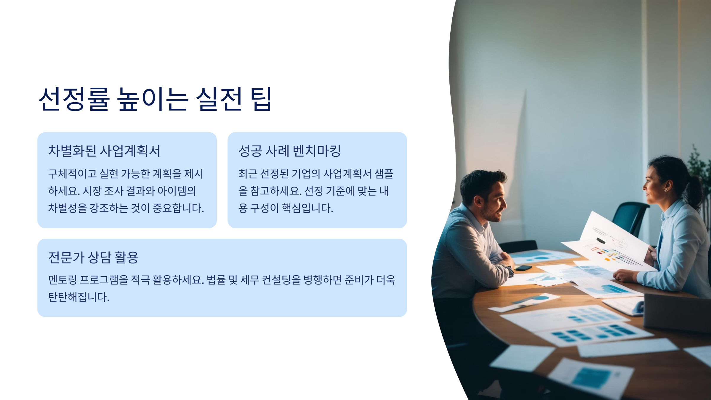 창업 지원금은 매년 수천 명이 지원하지만, 선정률은 10~20%대로 매우 낮은 편이에요. 그렇기 때문에 단순한 ‘좋은 아이디어’만으로는 부족하고, 심사위원의 눈길을 끌 수 있는 전략적 접근이 필요해요. 여기서 몇 가지 실전 팁을 공유할게요! 📌